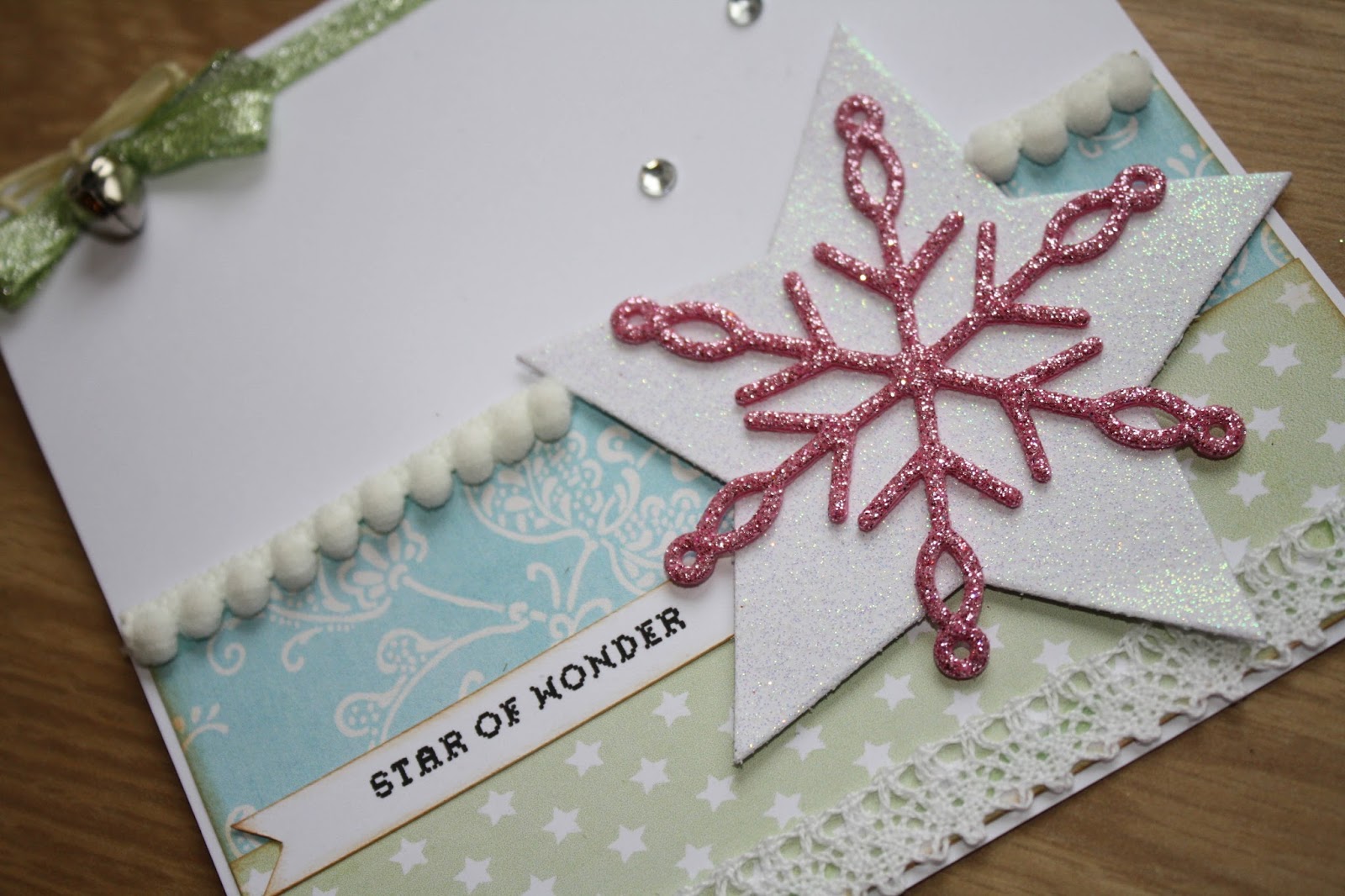 This next card is made using a die cut tag from Do crafts and Xcut. Which I have cut from pink glitter card and added some pink gingham ribbon. I love none traditional Christmas colours.