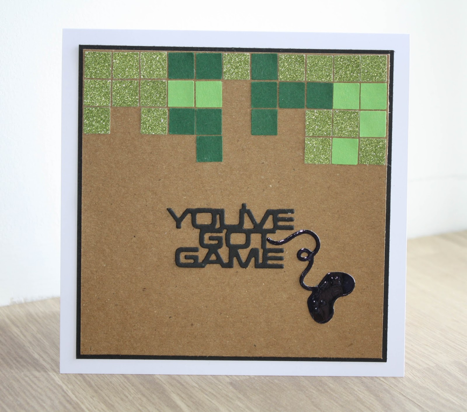 To make the card I mat and layered some kraft card stock onto a square of black. I then cut out some tiny squares in different shades of green. The base is supposed to look like an earth block which is used in the game.