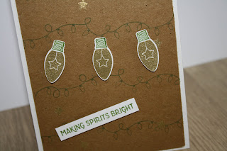 To make the card I started with a piece of kraft card stock and stamped the string Christmas lights from the set in garden green ink and added some gold embossed stars.